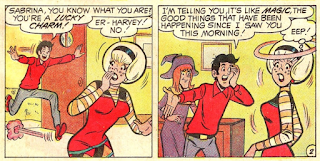 I should point out that Harvey was not the first boyfriend Sabrina had, which makes him all the more interesting. Information online is scant about Tommy Baker, but I know he at least appeared in Archie's Madhouse #55 and #59 (June and December 1967, respectively) and he was Sabrina's boyfriend in both appearances. He also knew about Sabrina's powers.